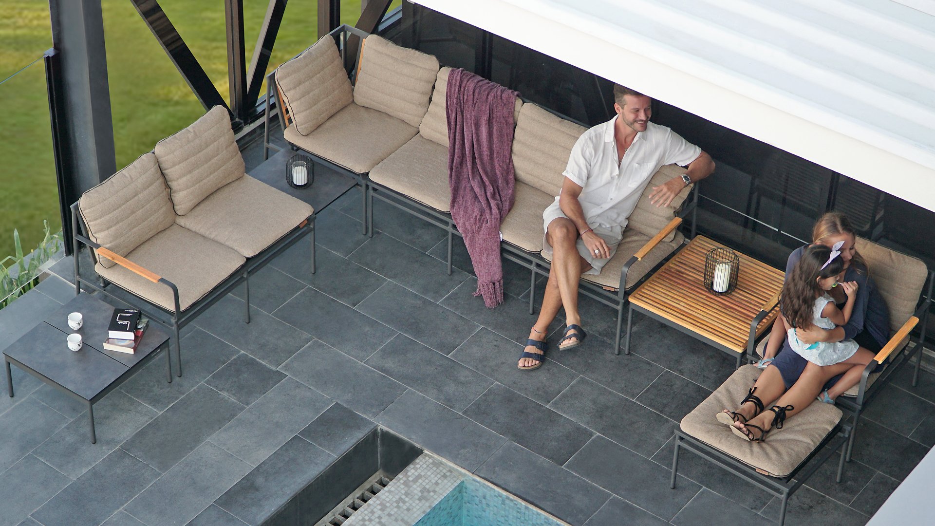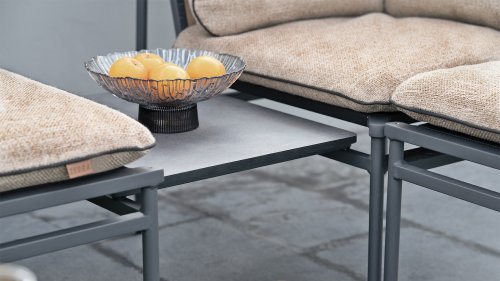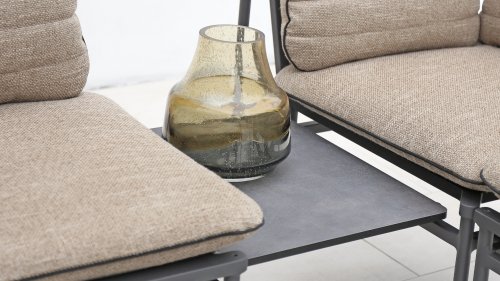 Sitzflächen aus hochwertigem Textilen und passende Sitzkissen aus wasserdichtem Sunny-Guard-Gewebe in der Farbe „macchiato“wirken gemütlich und laden zum Verweilen ein. Die neue greenline-Lounge besteht aus verschiedenen Elementen, die ganz nach Belieben und Platz beliebig miteinander kombiniert werden können. Dabei reicht die Auswahl an Elementen vom 3-Sitzer, 2-Sitzer oder Sessel über die Max Lounge Ecke, einen Hocker bis zum Max Lounge Verbindungstablett. Die gemütliche Lounge lässt sich zudem wahlweise mit zwei unterschiedlich großen Kaffeetischen oder einem Dining-Tisch kombinieren. Dabei bietet der in „graphite“ gehaltene Aluminium-Diningtisch mit einer Breite von 140 Zentimetern ausreichend Platz, um in angenehmer Sitzhaltung entspannt dinieren zu können.