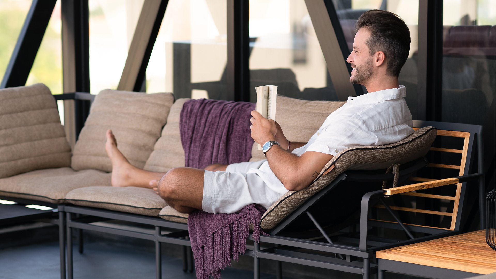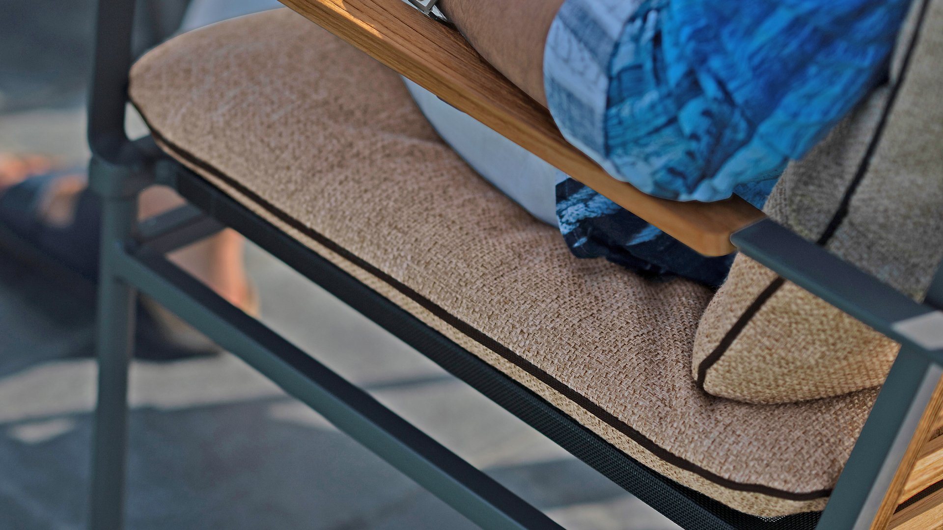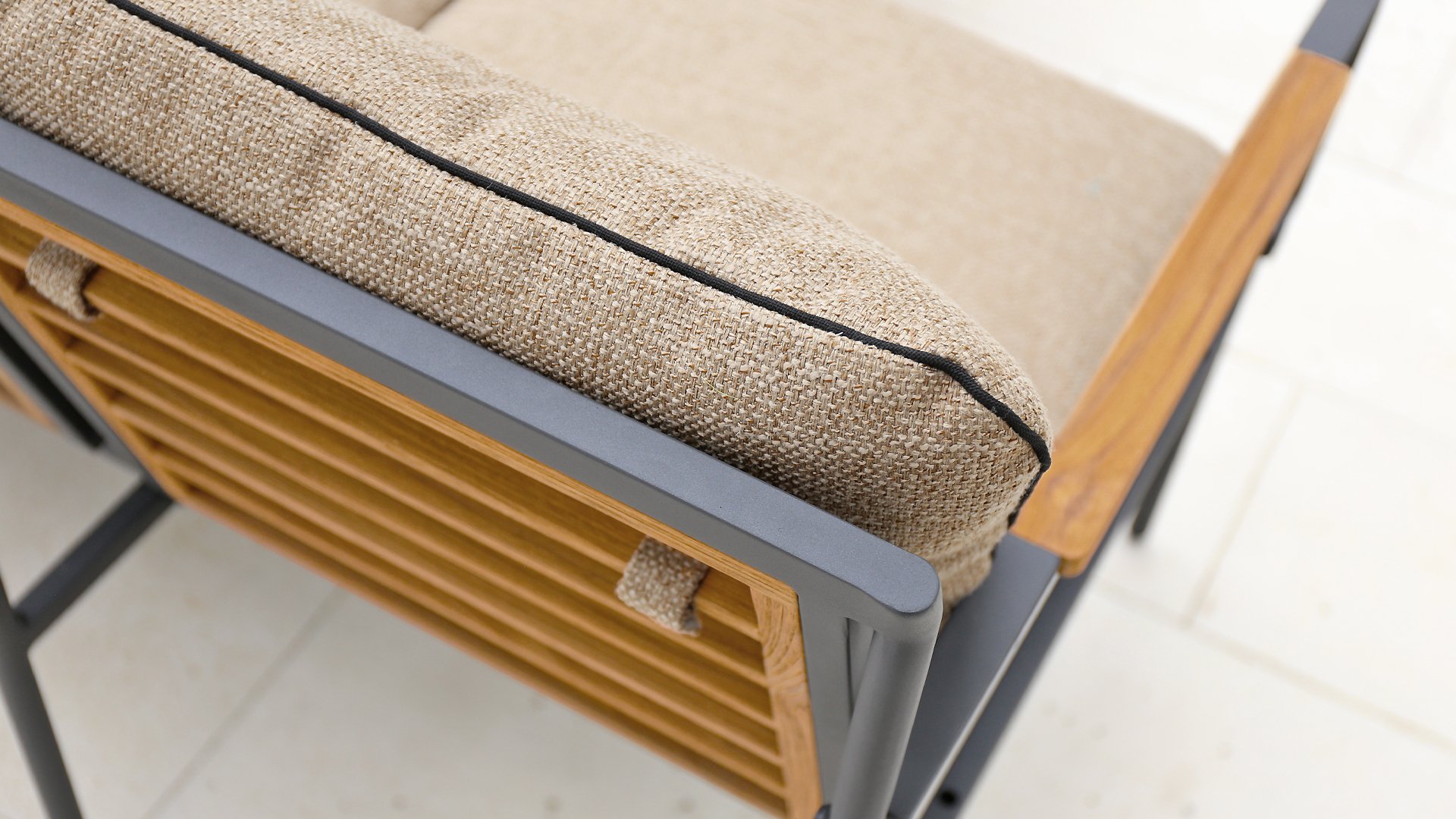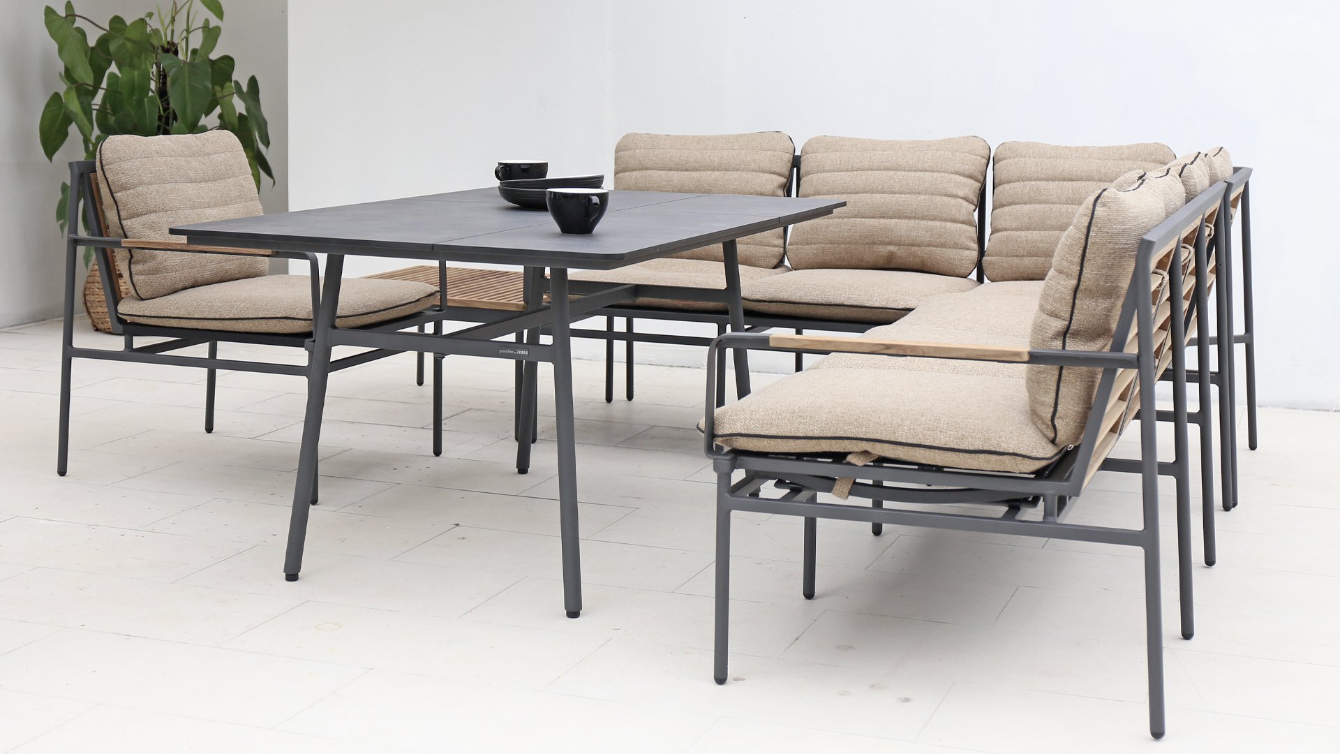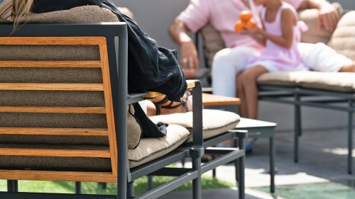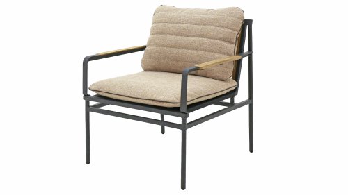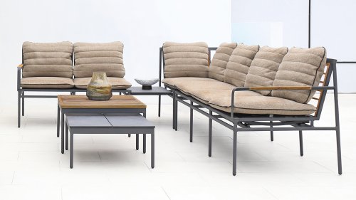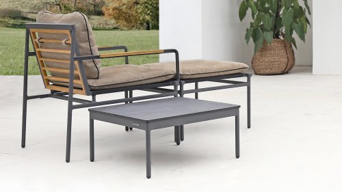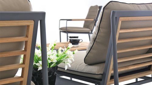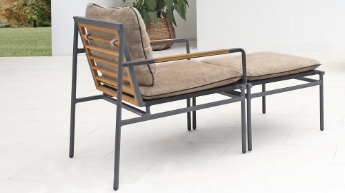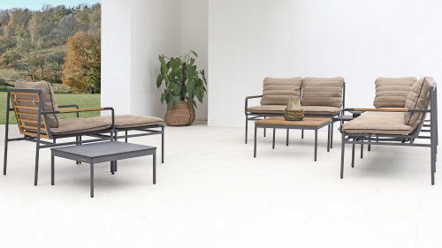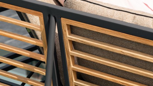 Die neue Max Lounge von Zebra besticht durch filigrane Linien und eine Materialkombination, die Akzente setzt. Das Gestell aus pulverbeschichtetem Aluminium in dunklem Grauton ("Graphite“) wirkt leicht und erzeugt zusammen mit den Rücken- und Armlehnen aus recyceltem Teakholz einen perfekten Kontrast.