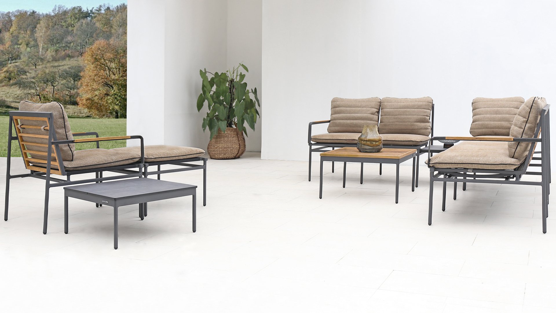 | Materialien Loungegruppe | Teak, Pulverbeschichtet Aluminium/Stahl |