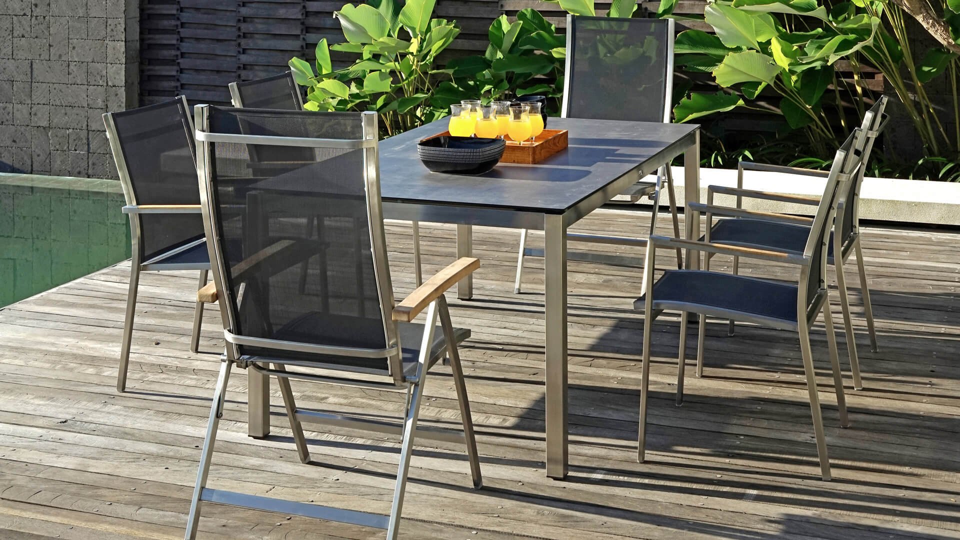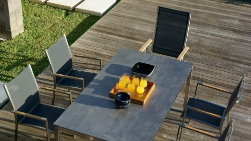 Das Zebra One Dining: Das Gestell aus gebürstetem Edelstahl ist mit Dark grey oder Dark platinum Textilene-Stoff bezogen. Dieser Edelstahl-Stapelstuhl 'One' von Zebra ist nicht nur ein ergonomisch perfektionierter Stuhl, sondern überzeugt auch durch sein minimalistisches Design und die fein abgesetzte Armlehne aus Teakholz in Edelstahl. Der Zebra One Gartenstuhl zeichnet sich, wie bei Stapelstühlen üblich, durch eine höhere Rückenlehne aus und schafft so einen wunderbaren Sitzkomfort. Auch stapelbare und verstellbare Stühle sind in dieser Serie erhältlich.