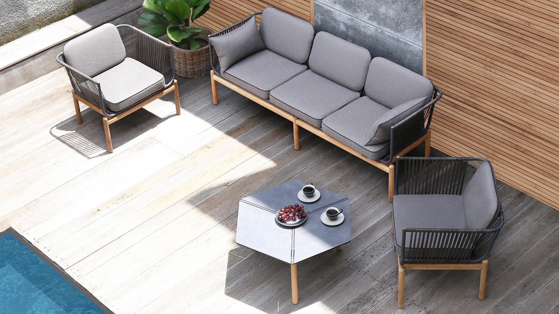 Die elegante Loungeserie Pollux bietet einen luxuriösen und einladenden Charakter in ihrem Außenbereich. Der große 3-Sitzer ist nicht nur äußerst gemütlich, sondern auch aus kostbaren Matrialen hergestellt. Das Gerüst bildet stabiles Aluminium sowie robustes und wetterfestes Teakholz. Veredelt wird das Ganze mit einer Seilbespannung (Rope) an der Arm- und Rücklehne.