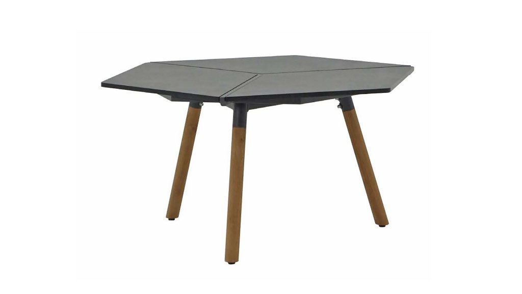 Der Kaffeetisch Pollux 7330 von Zebra besteht aus einer HPL (High Pressure Laminate) Tischplatte und Tischbeinen aus gebürstetem Teakholz. Die Verbindung zwischen den Teakbeinen und der Platte besteht aus Aluminium graphitfarben pulverbeschichtet.