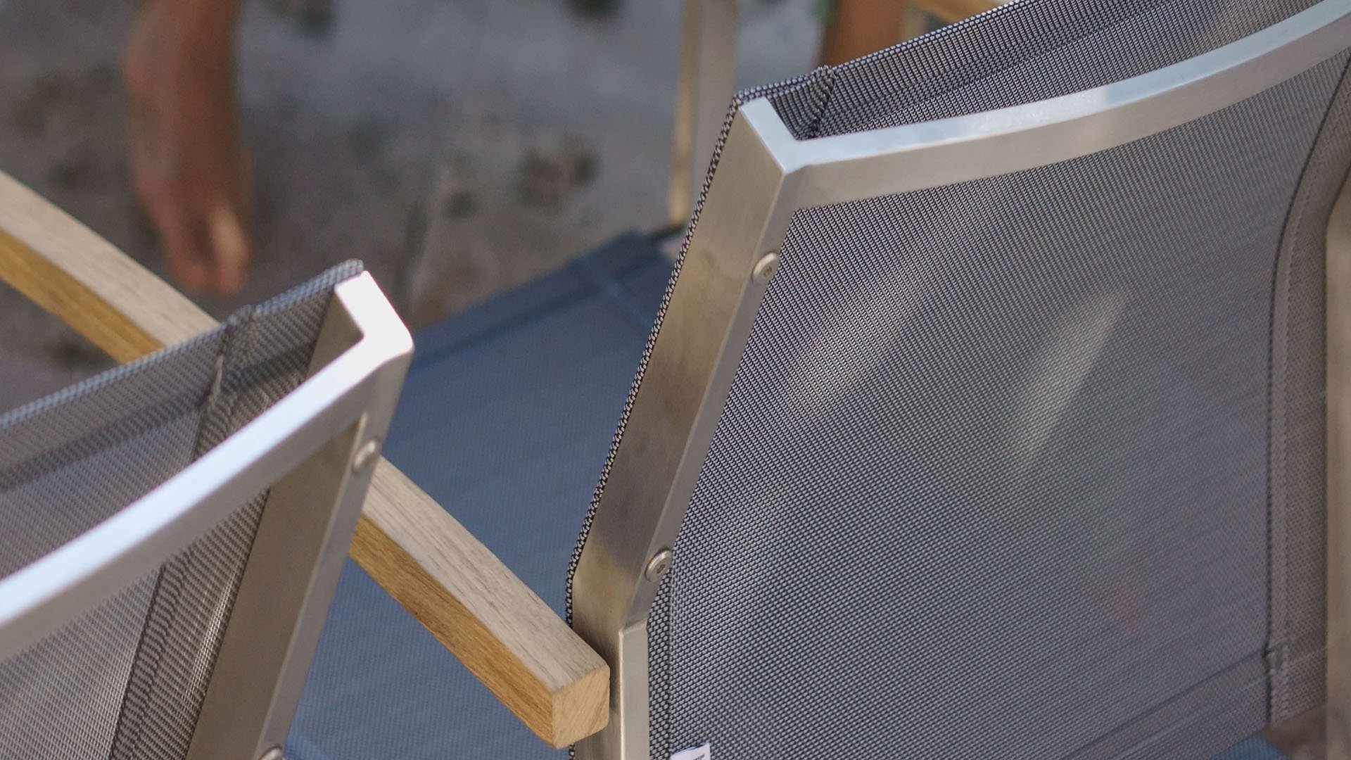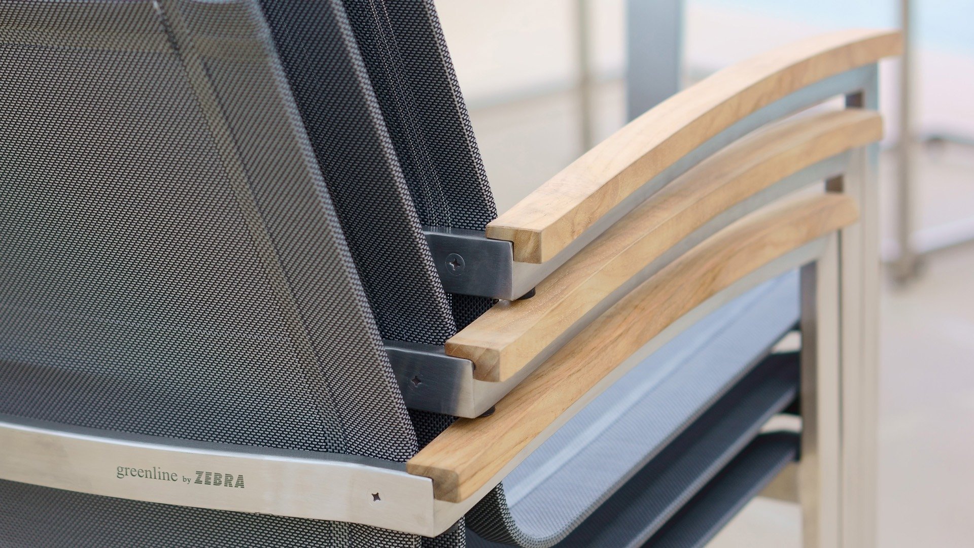 Die Zebra Setax Dining-Serie ist zeitlos und einfach zu kombinieren. Der Zebra Setax bringt optimalen Sitzkomfort und Benutzerfreundlichkeit. Mit der Teak-Armlehne als stilvollem Akzent. Dieser Zebra Setax ist in mehreren Versionen erhältlich, darunter als Stapelstuhl, Setax Schaukelstuhl, Setax Schaukelstuhl mit hoher Rückenlehne. Der Rahmen aus gebürstetem Edelstahl ist mit einem Midnight grey Textilene-Stoff bezogen.